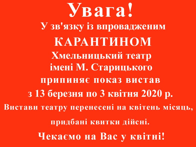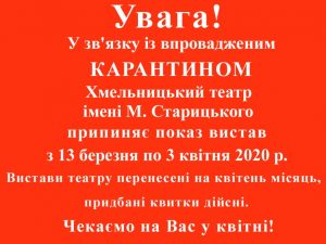 У зв’язку із впровадженим карантином Хмельницький театр ім. М. Старицького припиняє показ вистав. 13 Березня 2020 13 Березня 2020 / Новини